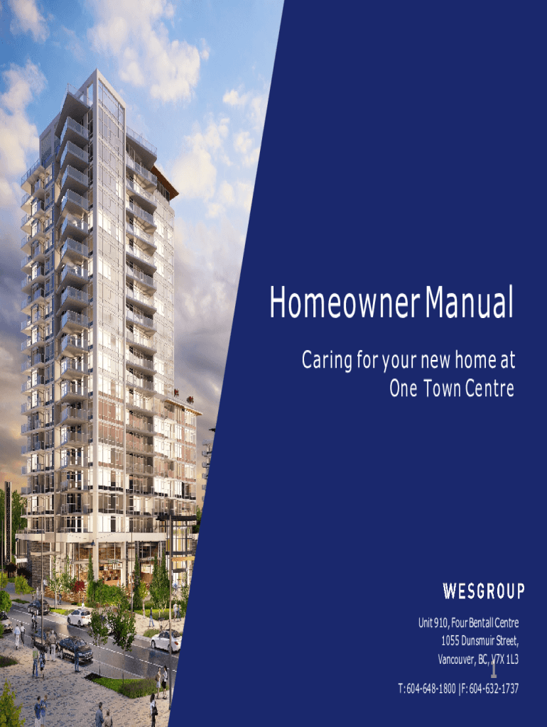 Homeowner Manual Caring for your new home at One Town Centrelink 910, Four Ben tall Center 1055 Langmuir Street, Vancouver, BC, V7X 1L31T: 6046481800 | F: 6046321737WELCOME HOME We are excited to