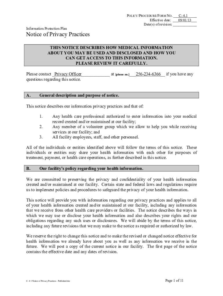 POLICY/PROCEDURE/FORM NO. ___C 4.1___ Effective date: ___09/01/13___ Date(s) of revision: ___ Information Protection Plaintive of Privacy Practices THIS NOTICE DESCRIBES HOW MEDICAL INFORMATION ABOUT