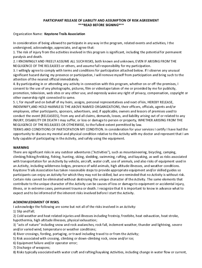 PARTICIPANT RELEASE OF LIABILITY AND ASSUMPTION OF RISK AGREEMENT ***READ BEFORE SIGNING*** Organization Name: Keystone Trails Association In consideration of being allowed to participate in any way