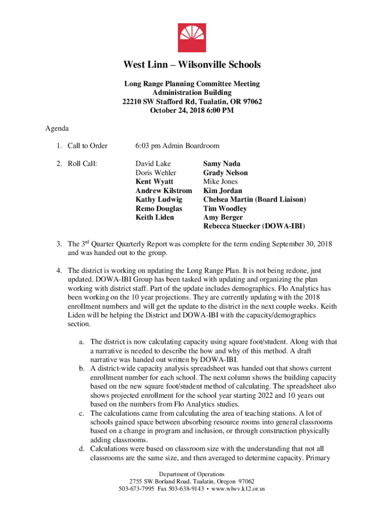 West Linn Wilsonville Schools Long Range Planning Committee Meeting Administration Building 22210 SW Stafford Rd, Tualatin, OR 97062 October 24, 2018 6:00 PM Agenda 1. Call to Order6:03 pm Admin Boardroom2.