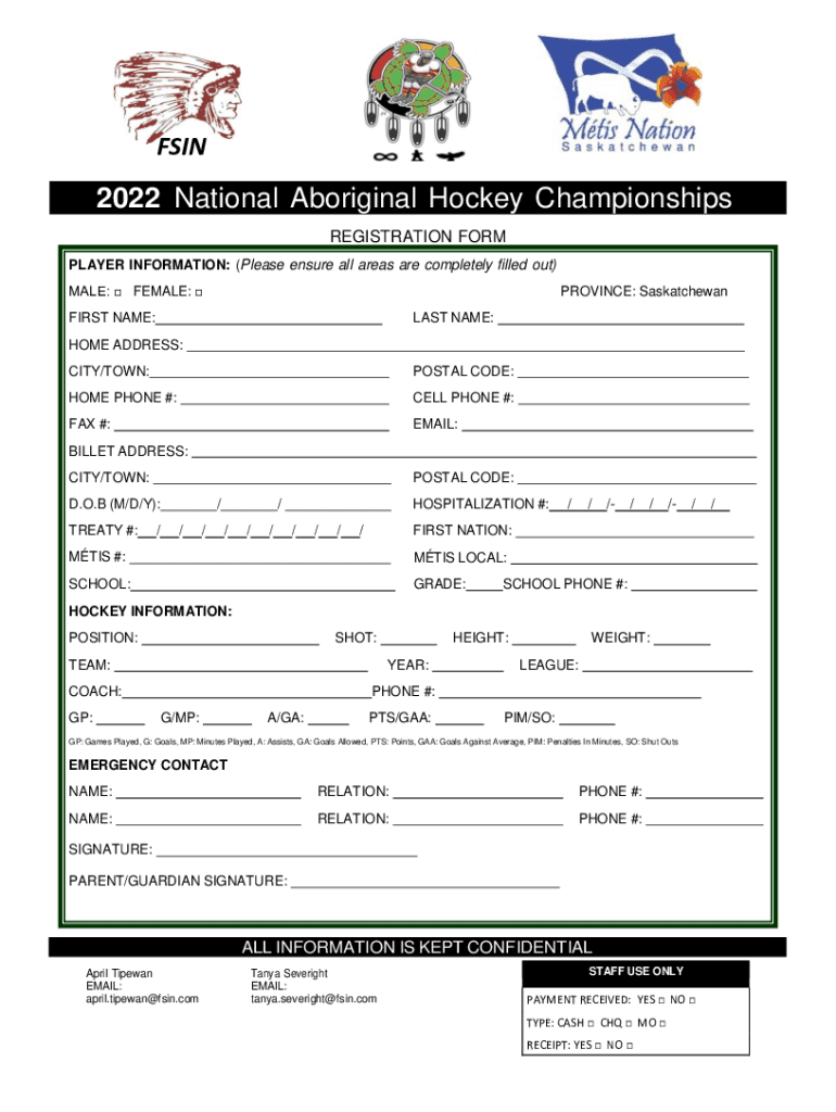 FSIN2022 National Aboriginal Hockey Championships REGISTRATION FORM PLAYER INFORMATION: (Please ensure all areas are completely filled out) MALE: FEMALE: PROVINCE: SaskatchewanFIRST NAME:LAST NAME:HOME