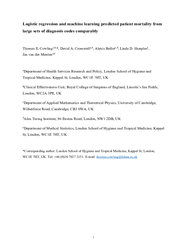 Logistic regression and machine learning predicted patient mortality from large sets of diagnosis codes comparably Thomas E. Cowling, b, ×, David A. Cromwell, b, Alexis Ballot, d, Linda D. Sharpness,