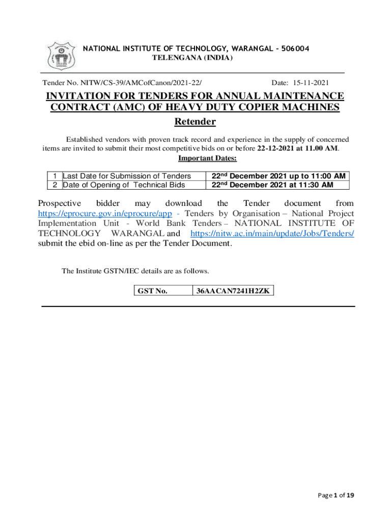 NATIONAL INSTITUTE OF TECHNOLOGY, WARANGAL 506004 TELANGANA (INDIA) Tender No. NITA/CS39/AMCofCanon/202122/Date: 15112021INVITATION FOR TENDERS FOR ANNUAL MAINTENANCE CONTRACT (AMC) OF HEAVY-DUTY