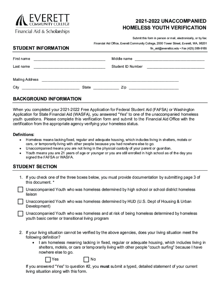 20212022 UNACCOMPANIED HOMELESS YOUTH VERIFICATION Submit this form in person or mail, electronically, or by fax:STUDENT INFORMATIONFinancial Aid Office, Everett Community College, 2000 Tower Street,