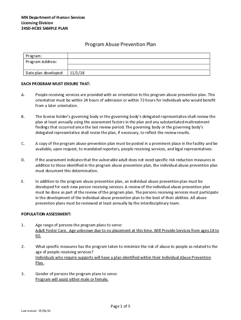 MN Department of Human Services Licensing Division 245DHCBS SAMPLE Pre-program Abuse Prevention Plan Program: Program Address: Date plan developed:11/1/18EACH PROGRAM MUST ENSURE THAT: A. People receiving