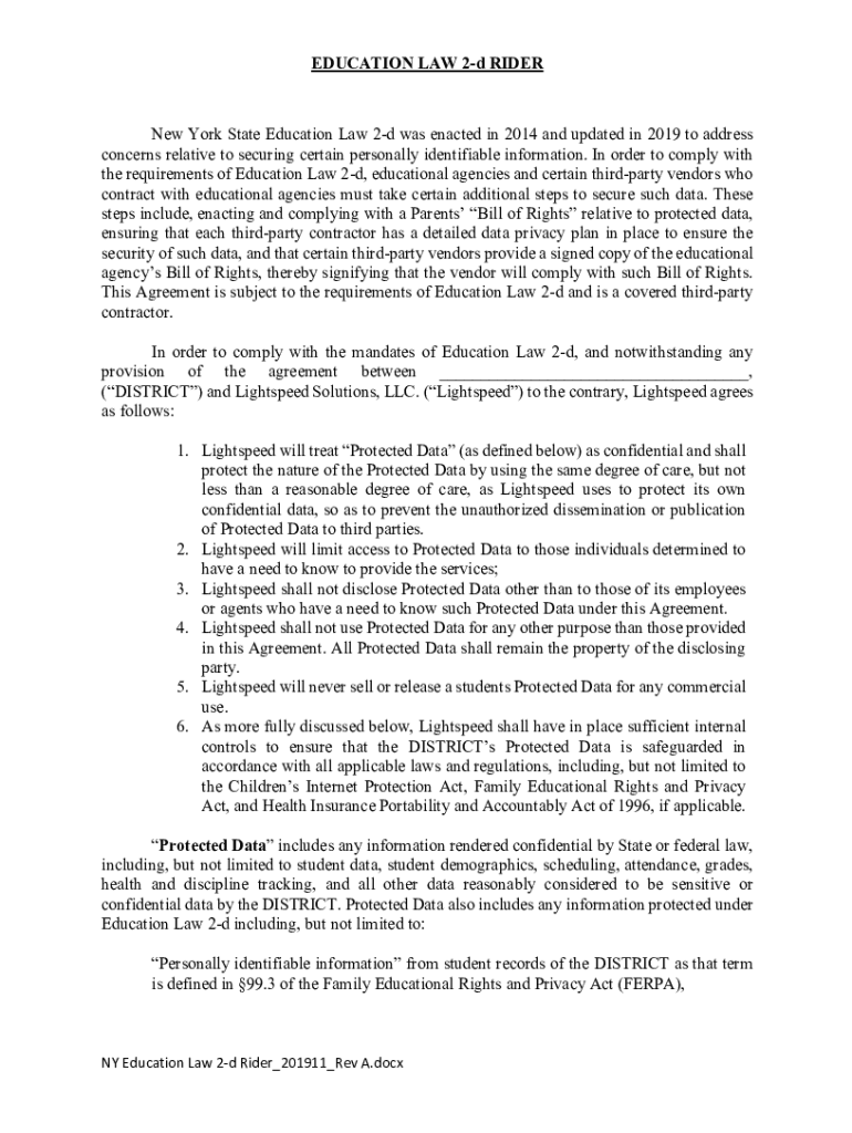 EDUCATION LAW 2d Rider York State Education Law 2d was enacted in 2014 and updated in 2019 to address concerns relative to securing certain personally identifiable information. In order to comply