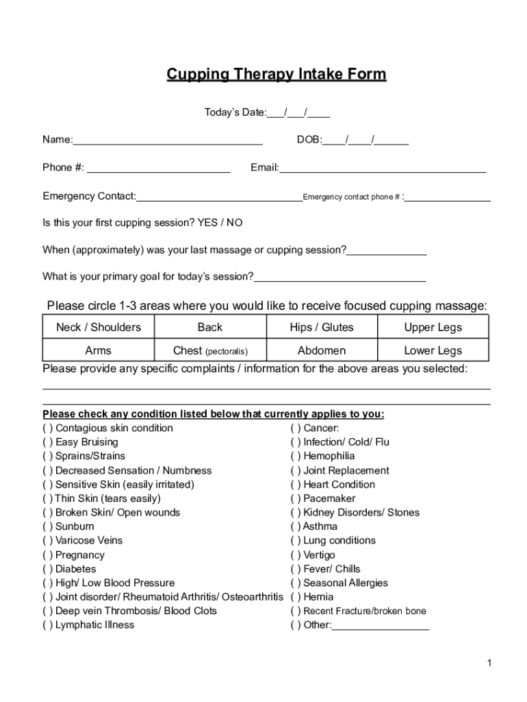 Cupping Therapy Intake Form Today's Date:___/___/___ Name:___ Phone #: ___DOB:___/___/___Email:___Emergency Contact:___Emergency contact phone # :___ Is this your first cupping session? YES / NO When