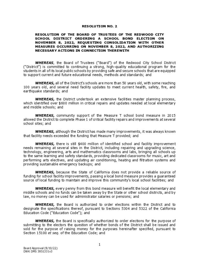 RESOLUTION NO. 2 RESOLUTION OF THE BOARD OF TRUSTEES OF THE REDWOOD CITY SCHOOL DISTRICT ORDERING A SCHOOL BOND ELECTION ON NOVEMBER 8, 2022, REQUESTING CONSOLIDATION WITH OTHER MEASURES OCCURRING