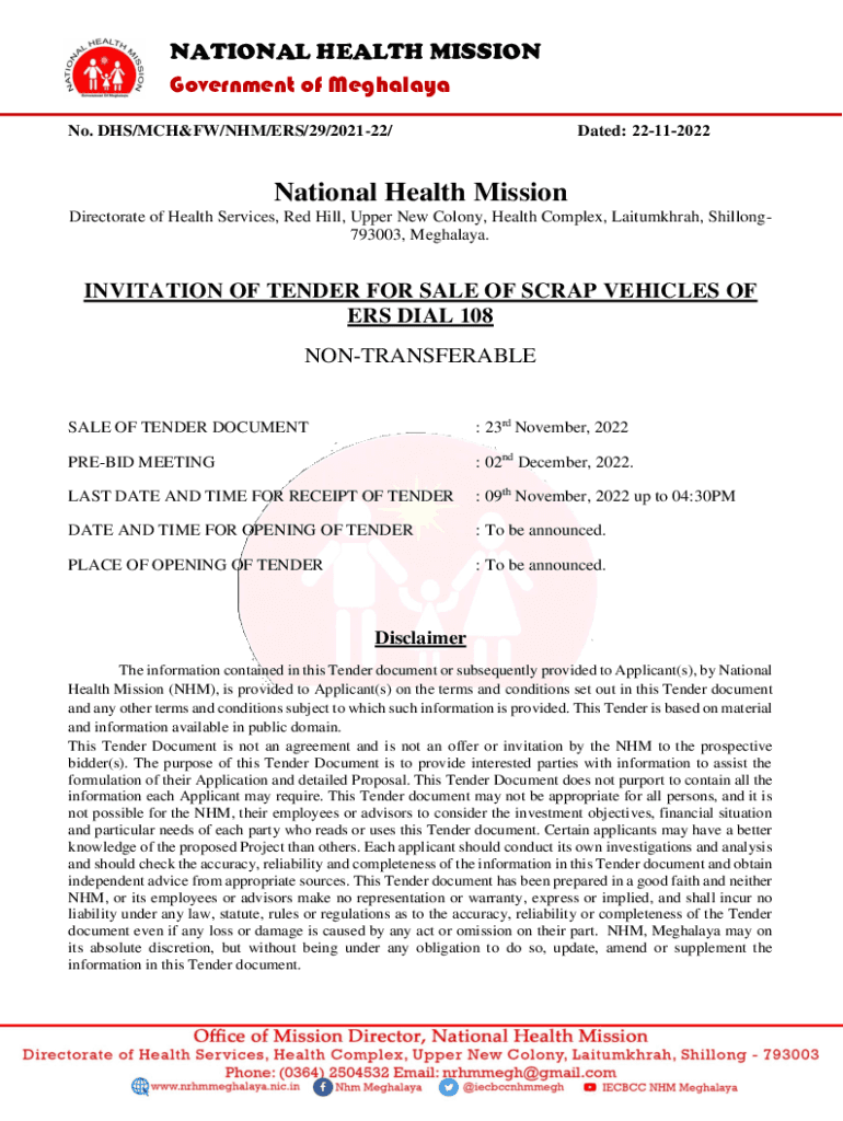 NATIONAL HEALTH MISSION Government of Meghalaya Dated: 22112022No. DHS/CHEF/NHS/ERS/29/202122/National Health Mission Directorate of Health Services, Red Hill, Upper New Colony, Health Complex, Laitumkhrah,
