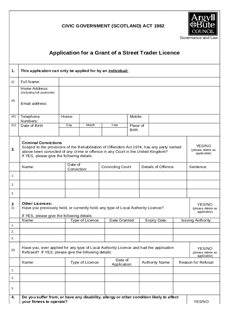 The street trader licensing under the civic government (scotland ... is a Word document required to be submitted to the specific address to provide specific info. It needs to be completed and signed, which may be done manually in hard copy, or via a certain solution like PDFfiller. This tool helps to complete any PDF or Word document directly in your browser, customize it according to your needs and put a legally-binding electronic signature. Right away after completion, user can easily send the street trader licensing under the civic government (scotland ... to the relevant person, or multiple individuals via email or fax. The editable template is printable as well because of PDFfiller feature and options proposed for printing out adjustment. Both in electronic and physical appearance, your form will have got organized and professional appearance. Also you can save it as the template for later, so you don't need to create a new document from scratch. Just amend the ready sample.