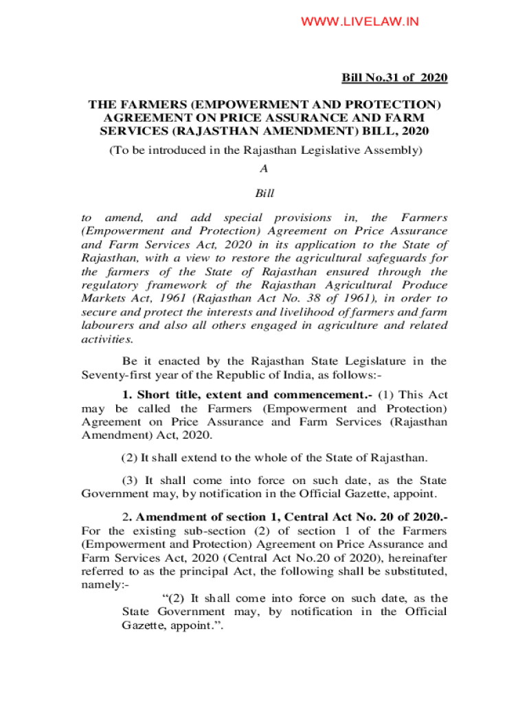 WWW.LIVE LAW. Infill No.31 of 2020 THE FARMERS (EMPOWERMENT AND PROTECTION) AGREEMENT ON PRICE ASSURANCE AND FARM SERVICES (RAJASTHAN AMENDMENT) BILL, 2020 (To be introduced in the Rajasthan Legislative