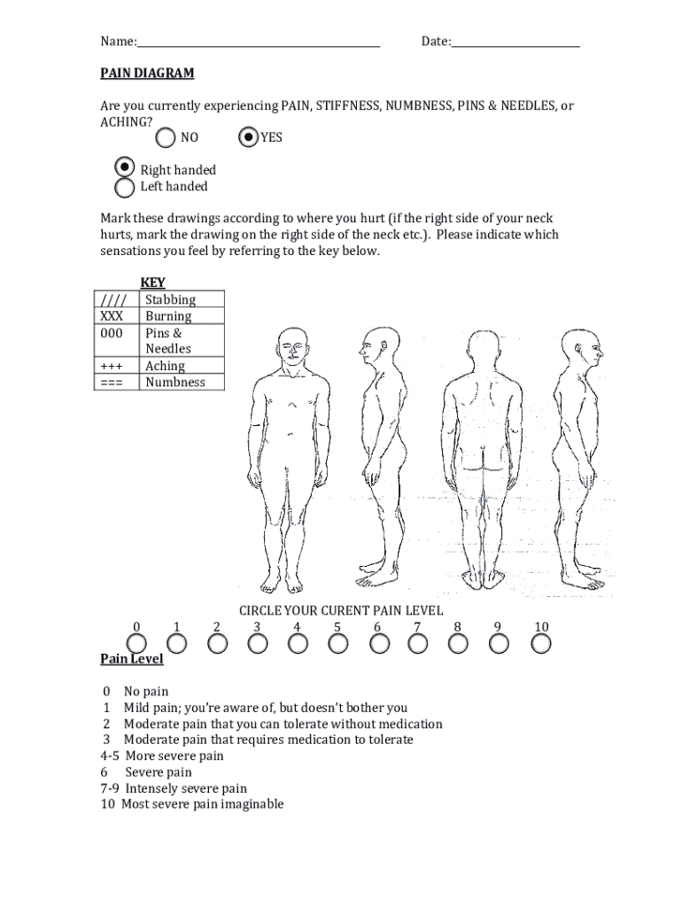 Name:___ PAIN Diagrammatic:___Are you currently experiencing PAIN, STIFFNESS, NUMBNESS, PINS & NEEDLES, or ACHING? NO YES o Right handed o Left handed Mark these drawings according to where you hurt