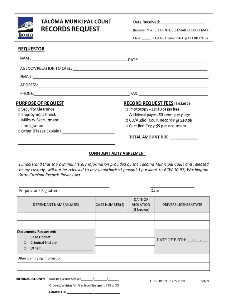 TACOMA MUNICIPAL Courage Received:RECORDS REQUESTReceived Via: COUNTER EMAIL FAX Miller:___ Added to Records Log CDK ENTRYREQUESTOR NAME:DATE:_AGENCY/RELATION TO CASE: EMAIL: ADDRESS: PHONE:FAX:PURPOSE