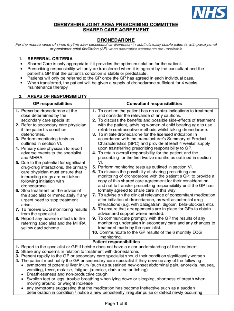 DERBYSHIRE JOINT AREA PRESCRIBING COMMITTEE SHARED CARE AGREEMENT For the maintenance of sinus rhythm after successful cardioversion in adult clinically stable patients with paroxysmal or persistent
