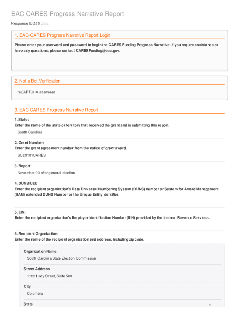 EAC CARES Progress Narrative Report Response ID:250 Data1. DAYCARES Progress Narrative Report Login Please enter your user word and password to begin the CARES Funding Progress Narrative. If you require
