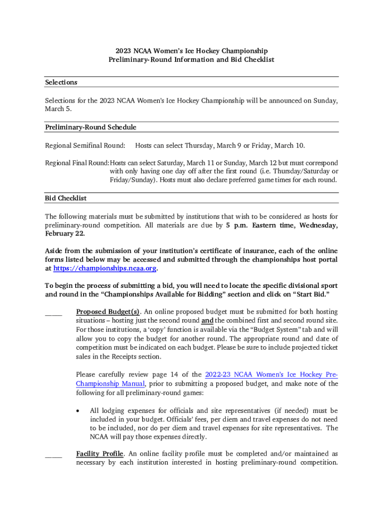 2023 NCAA Women's Ice Hockey Championship PreliminaryRound Information and Bid Checklist Selections for the 2023 NCAA Women's Ice Hockey Championship will be announced on Sunday, March 5. PreliminaryRound
