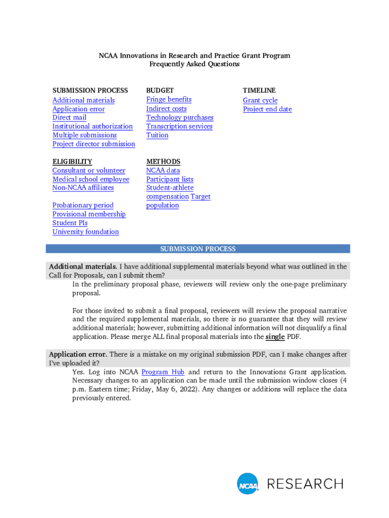 NCAA Innovations in Research and Practice Grant Program Frequently Asked Questions SUBMISSION PROCESS Additional materials Application error Direct mail Institutional authorization Multiple submissions