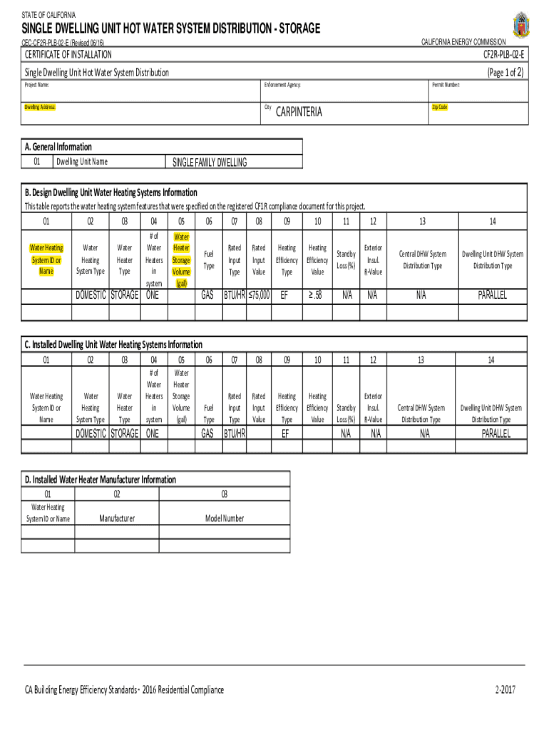 STATE OF CALIFORNIASINGLE DWELLING UNIT HOT WATER SYSTEM DISTRIBUTION STORAGE CALIFORNIA ENERGY COMMISSIONCECCF2RPLB02E (Revised 06/16)CERTIFICATE OF INSTALLATION Single Dwelling Unit Hot Water System