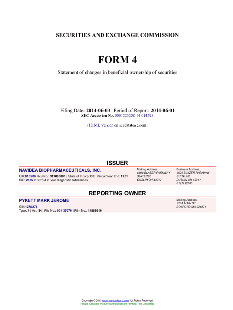 Get the free NAVIDEA BIOPHARMACEUTICALS, INC. Form 4 Filed 2014-06-03. Accession Number