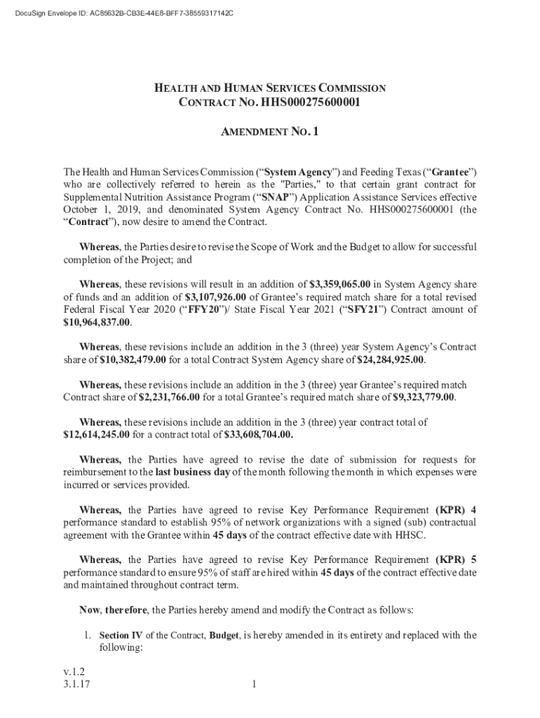 HEALTH AND HUMAN SERVICES COMMISSION CONTRACT NO. HHS000275600001 AMENDMENT NO. 1 The Health and Human Services Commission (System Agency) and Feeding Texas (Grantee) who are collectively referred