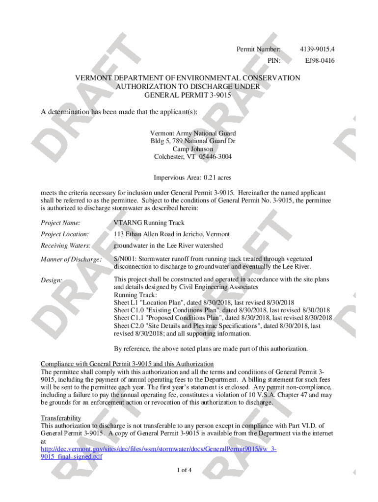 Permit Number:41399015.4PIN:EJ980416VERMONT DEPARTMENT OF ENVIRONMENTAL CONSERVATION AUTHORIZATION TO DISCHARGE UNDER GENERAL PERMIT 39015 A determination has been made that the applicant(s): Vermont