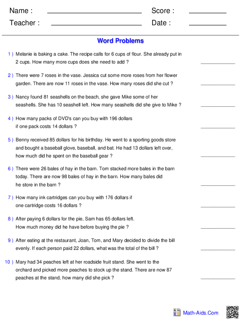 Name :Score :Teacher :Date : Word Problems1) Melanie is baking a cake. The recipe calls for 6 cups of flour. She already put in 2 cups. How many more cups does she need to add ?___2) There were 7