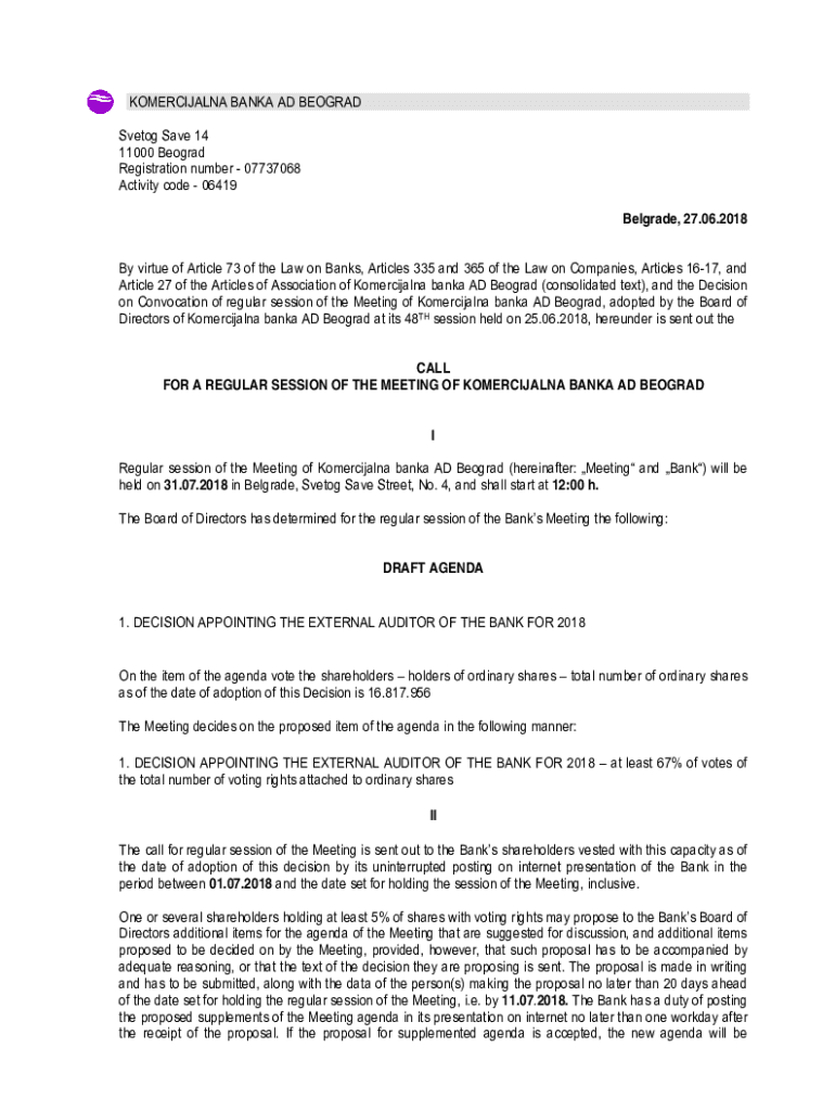 KOMERCIJALNA BANK AAD BELGRADE Veto Save 14 11000 Belgrade Registration number 07737068 Activity code 06419 Belgrade, 27.06.2018 By virtue of Article 73 of the Law on Banks, Articles 335 and 365 of