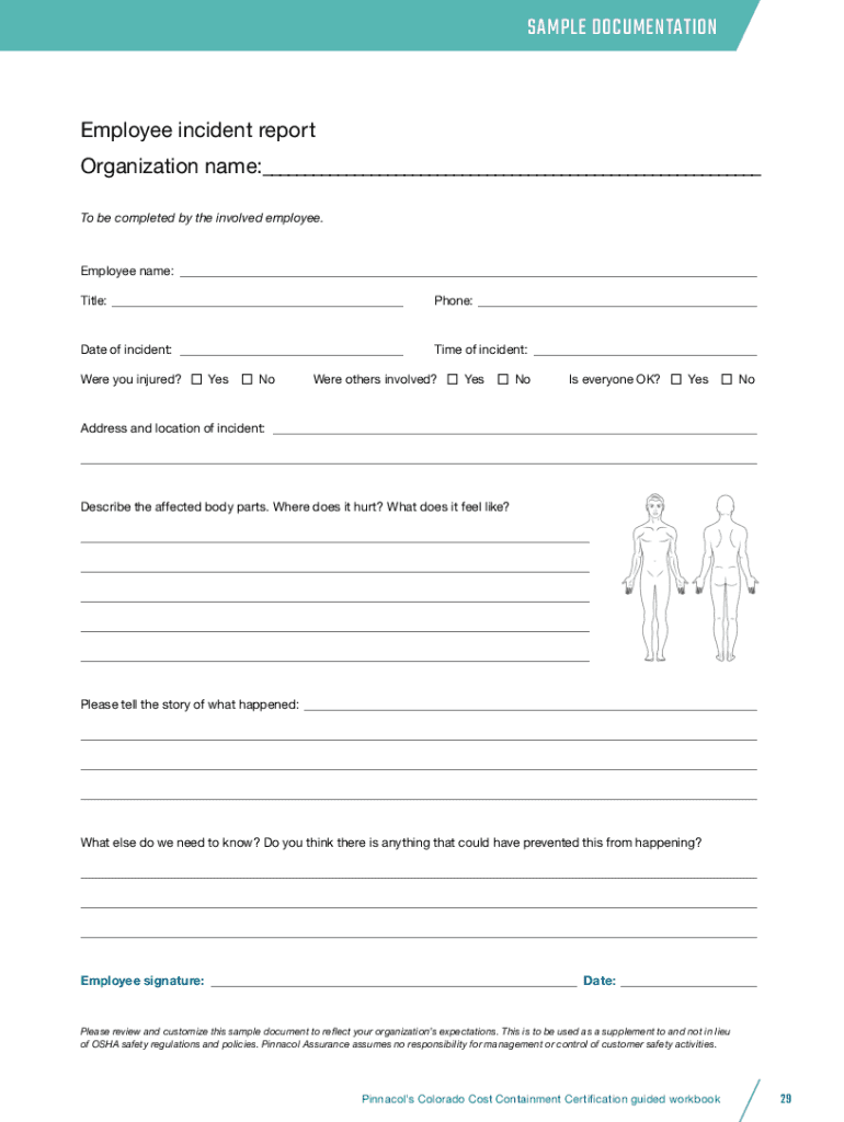 SAMPLE DOCUMENTATIONEmployee incident report Organization name:___ To be completed by the involved employee. Employee name: ___ Title: ___Phone: ___Date of incident: ___Time of incident: ___Were you