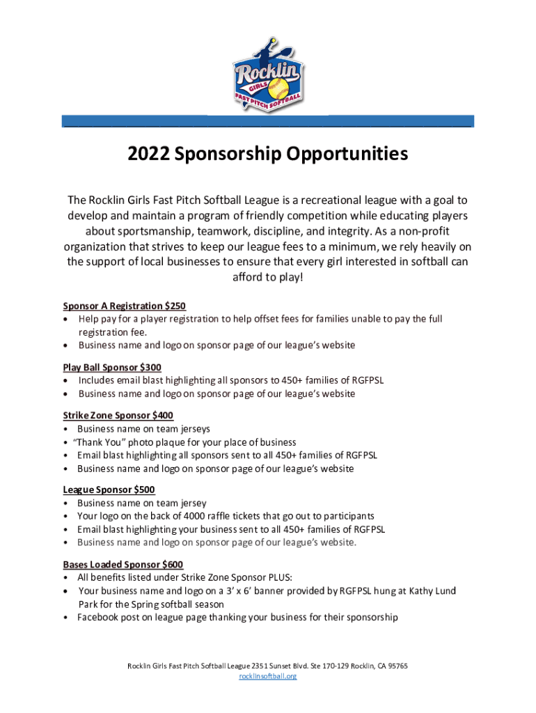___2022 Sponsorship Opportunities The Rocking Girls Fast Pitch Softball League is a recreational league with a goal to develop and maintain a program of friendly competition while educating players