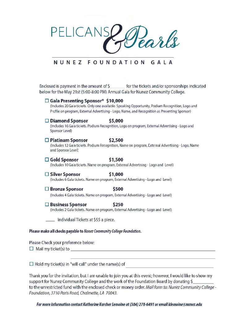 PELICANS NUNEZFOUNDATIONGALAEnclosed is payment in the amount of ___ for the tickets and/or sponsorships indicated below for the May 21st (5:008:00 PM) Annual Gala for Nunez Community College. Gala