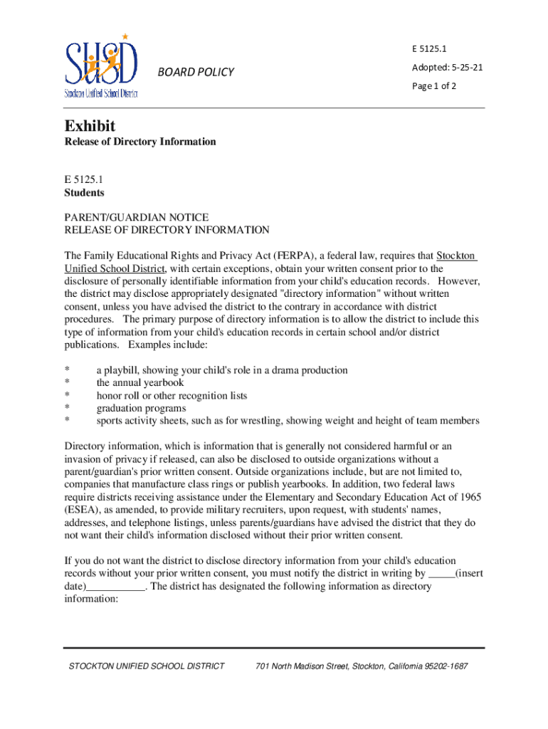 E 5125.1 Adopted: 52521BOARD POLICY Page 1 of 2Exhibit Release of Directory Information 5125.1 Students PARENT/GUARDIAN NOTICE RELEASE OF DIRECTORY INFORMATION The Family Educational Rights and Privacy
