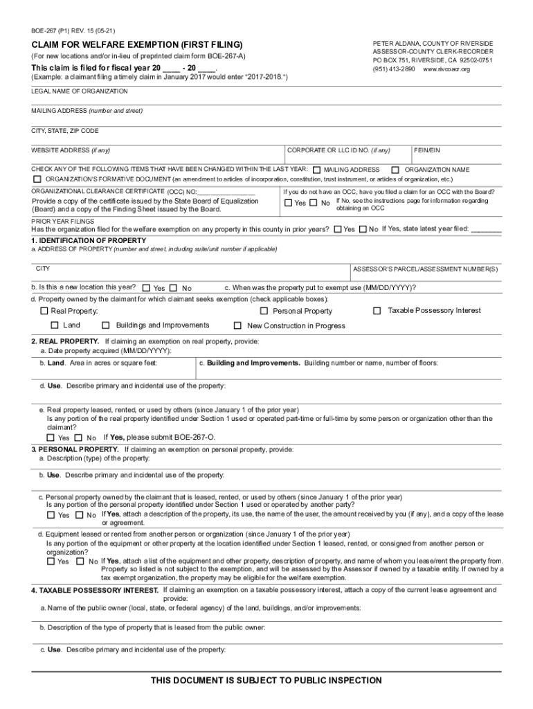BOE267 (P1) REV. 15 (0521)CLAIM FOR WELFARE EXEMPTION (FIRST FILING)PETER ADANA, COUNTY OF RIVERSIDE ASSESSORCOUNTY CLERKRECORDER PO BOX 751, RIVERSIDE, CA 925020751 (951) 4132890 www.rivcoacr.org(For