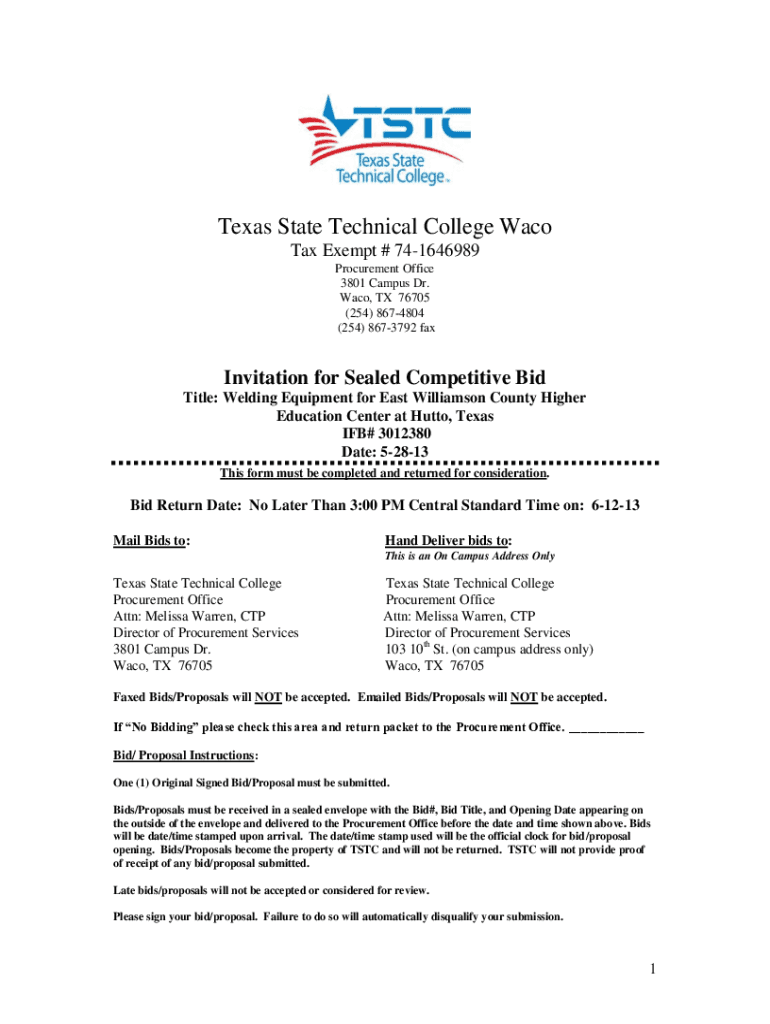 Texas State Technical College Waco Tax Exempt # 741646989 Procurement Office 3801 Campus Dr. Waco, TX 76705 (254) 8674804 (254) 8673792 invitation for Sealed Competitive Bid Title: Welding Equipment