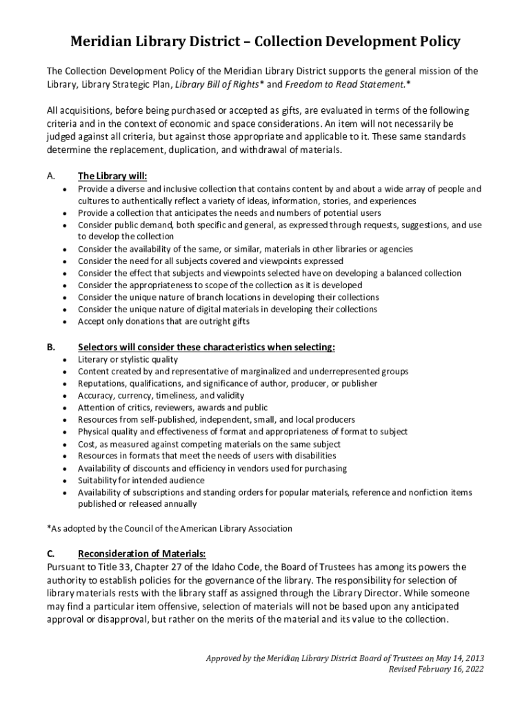 Meridian Library District Collection Development Police Collection Development Policy of the Meridian Library District supports the general mission of the Library, Library Strategic Plan, Library
