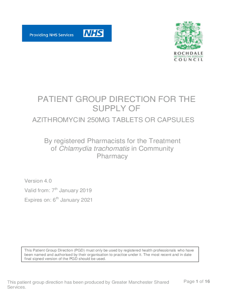 PATIENT GROUP DIRECTION FOR THE SUPPLY OF 250MG TABLETS OR CAPSULES By registered Pharmacists for the Treatment of Chlamydia trachomas in Community PharmacyVersion 4.0 Valid from: 7th January 2019