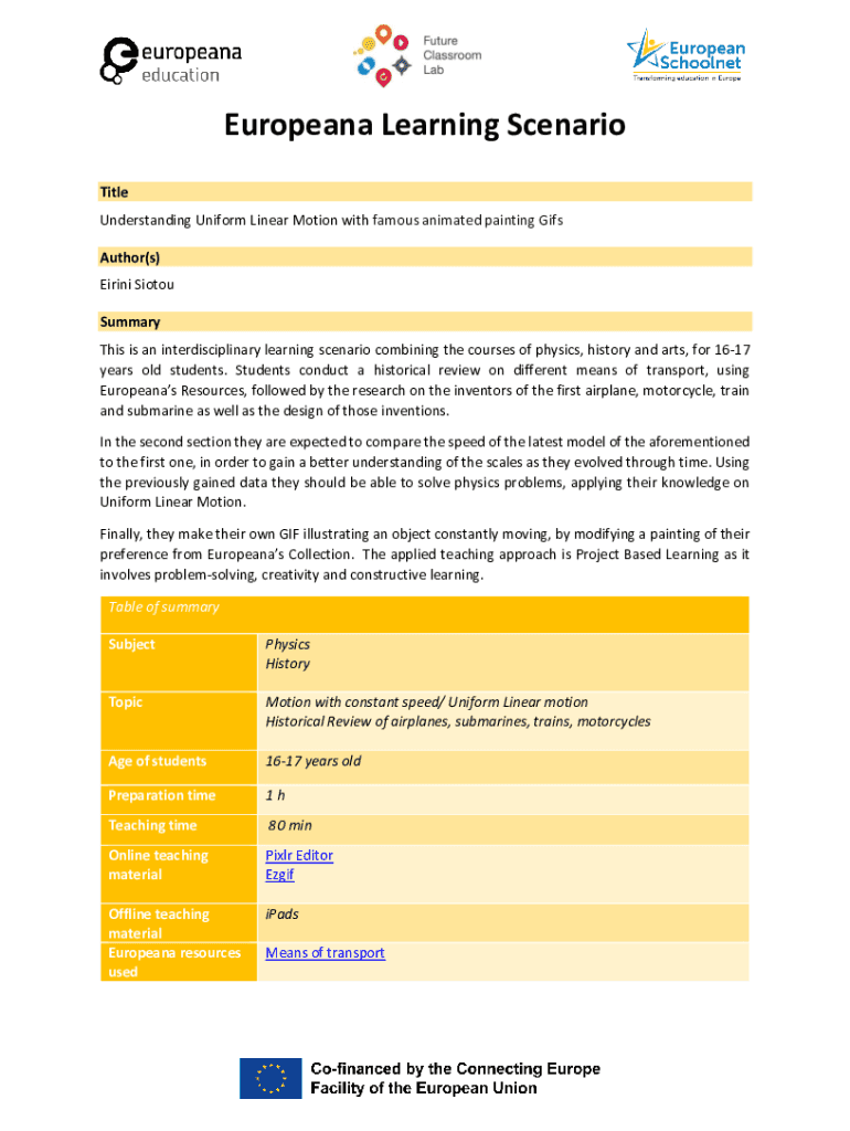 European Learning Scenario Title Understanding Uniform Linear Motion with famous animated painting GIFs Author(s) Firing Soto Summary This is an interdisciplinary learning scenario combining the courses