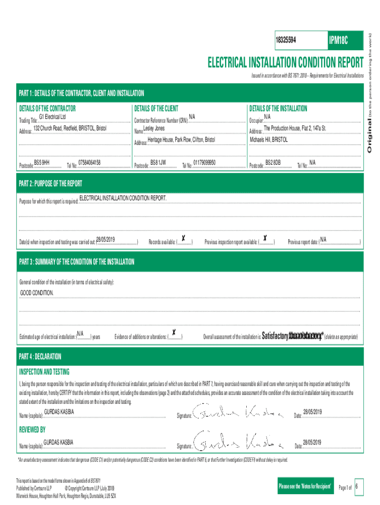 ELECTRICAL INSTALLATION CONDITION REPORT Issued in accordance with BS 7671: 2018 Requirements for Electrical InstallationsPART 1 : DETAILS OF THE CONTRACTOR, CLIENT AND INSTALLATION DETAILS OF THE