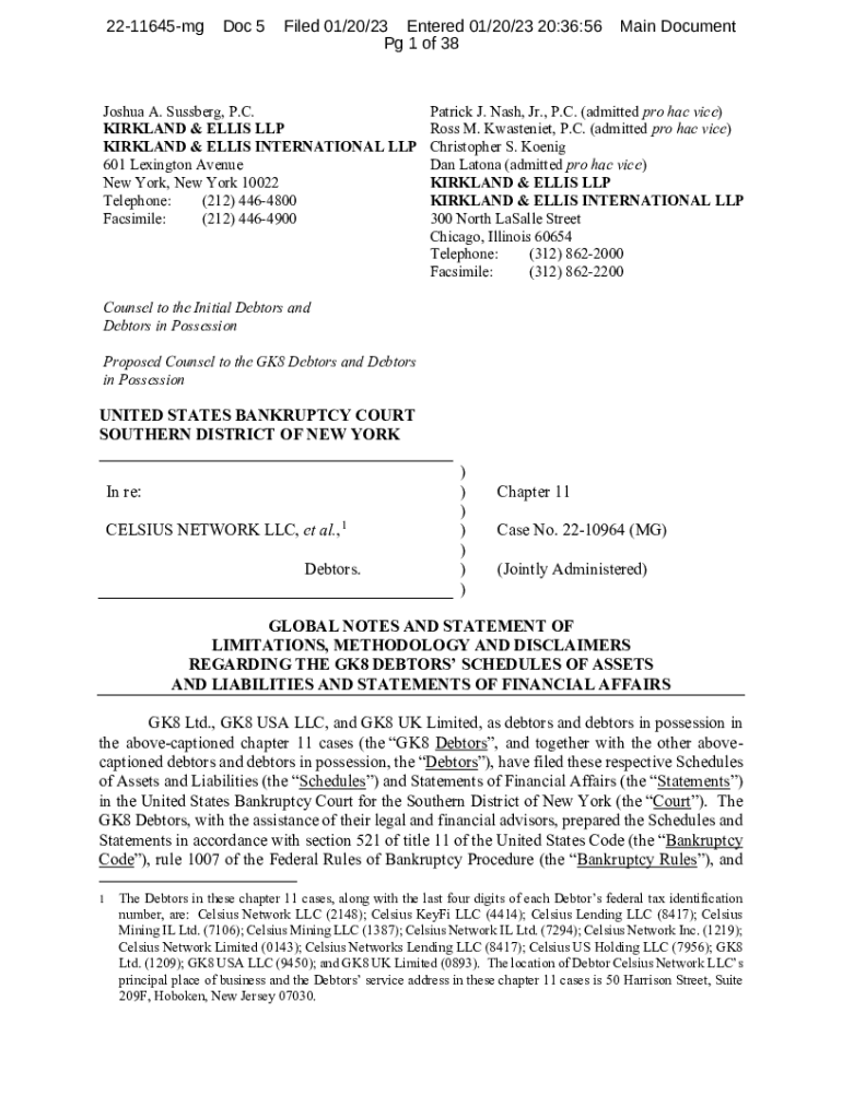 2211645mgDoc 5Filed 01/20/23 Entered 01/20/23 20:36:56 Pg 1 of 38Joshua A. Suss berg, P.C. KIRKLAND & ELLIS LLP KIRKLAND & ELLIS INTERNATIONAL LLP 601 Lexington Avenue New York, New York 10022 Telephone: