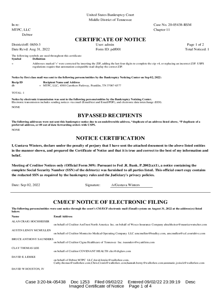 United States Bankruptcy Court Middle District of Tennessee In re: MTC, LLC Debtor Case No. 2005438RSM Chapter 11CERTIFICATE OF NOTICE District/off: 06503 Date RCD: Aug 31, 2022User: admin Form ID: