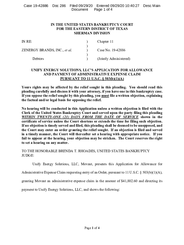 Case 1942886Doc 286Filed 09/29/20 Entered 09/29/20 10:40:27 Document Page 1 of 4Desc Main IN THE UNITED STATES BANKRUPTCY COURT FOR THE EASTERN DISTRICT OF TEXAS SHERMAN DIVISION IN RE: ENERGY BRANDS,