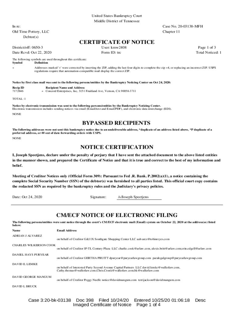 United States Bankruptcy Court Middle District of Tennessee In re: Old Time Pottery, LLC Debtor(s)Case No. 2003138MFH Chapter 11CERTIFICATE OF NOTICE District/off: 06503 Date RCD: Oct 22, 2020User: