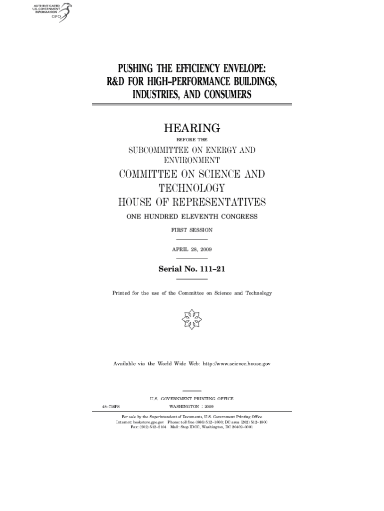PUSHING THE EFFICIENCY ENVELOPE: R&D FOR HIGHPERFORMANCE BUILDINGS, INDUSTRIES, AND CONSUMERS HEARING BEFORE SUBCOMMITTEE ON ENERGY AND ENVIRONMENTCOMMITTEE ON SCIENCE AND TECHNOLOGY HOUSE OF REPRESENTATIVES