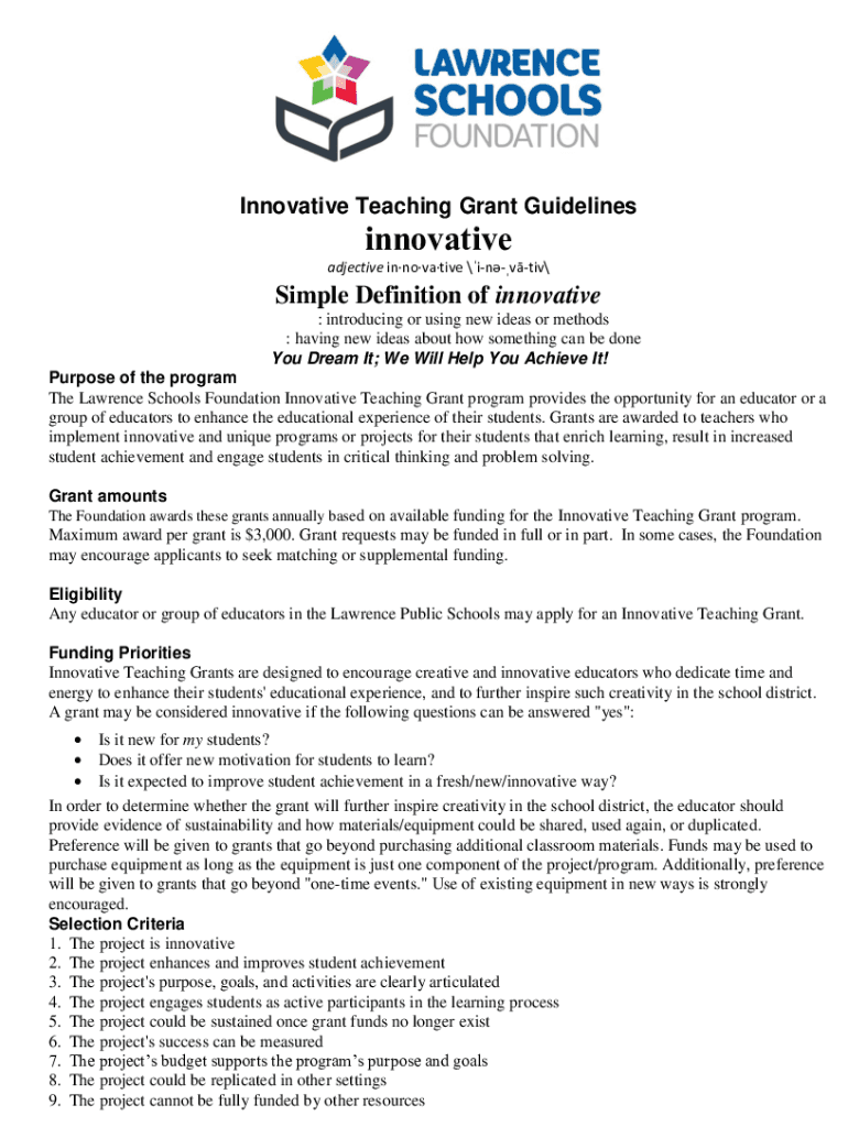 Innovative Teaching Grant Guidelines innovative adjective innovative invtivSimple Definition of innovative : introducing or using new ideas or methods : having new ideas about how something can be