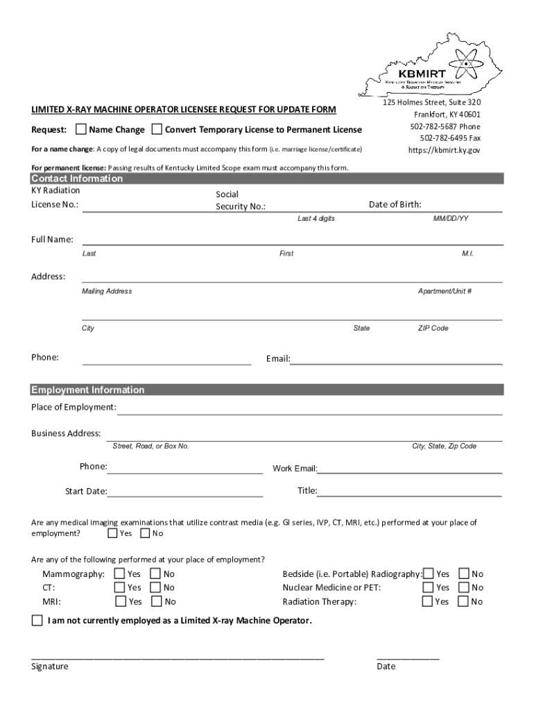 125 Holmes Street, Suite 320 Frankfort, KY 40601 5027825687 Phone 5027826495 Fax https://kbmirt.ky.govLIMITED RAY MACHINE OPERATOR LICENSEE REQUEST FOR UPDATE FORM Request:Name Changeover Temporary