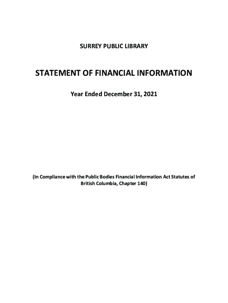 SURREY PUBLIC LIBRARYSTATEMENT OF FINANCIAL INFORMATION Year Ended December 31, 2021(In Compliance with the Public Bodies Financial Information Act Statutes of British Columbia, Chapter 140)Surrey