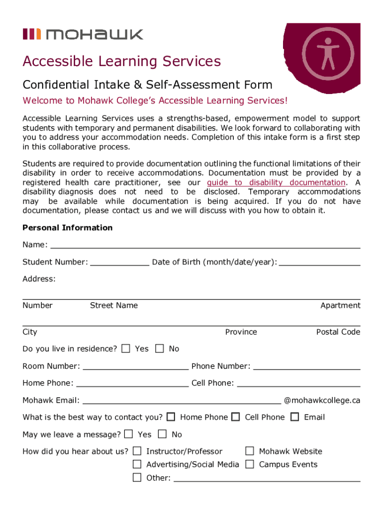 Accessible Learning Services Confidential Intake & Reassessment Form Welcome to Mohawk Colleges Accessible Learning Services! Accessible Learning Services uses a strengths based, empowerment model