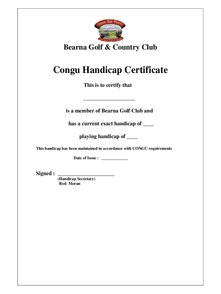 Arena Golf & Country Clubbing Handicap Certificate This is to certify that ___ is a member of Arena Golf Club and has a current exact handicap of ___ playing handicap of ___ This handicap has been
