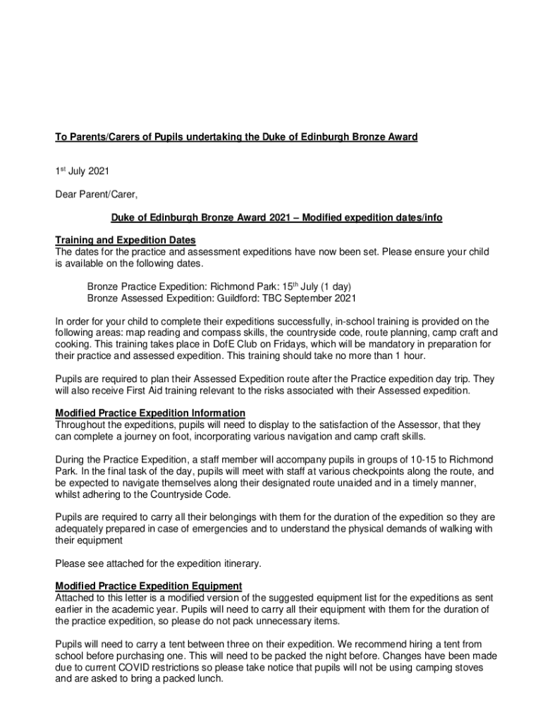 To Parents/Carers of Pupils undertaking the Duke of Edinburgh Bronze Award 1st July 2021 Dear Parent/Carer, Duke of Edinburgh Bronze Award 2021 Modified expedition dates/info Training and Expedition