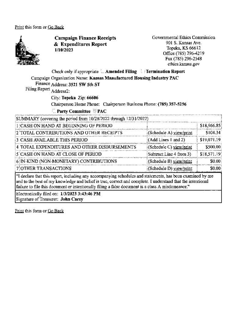 Print this form or Go Back Governmental Ethics Commission 901 S. Kansas Ave. Topeka, KS 66612 Office (785) 2964219 Fax (785) 2962548 ethics. Kansas.campaign Finance Receipts & Expenditures Report