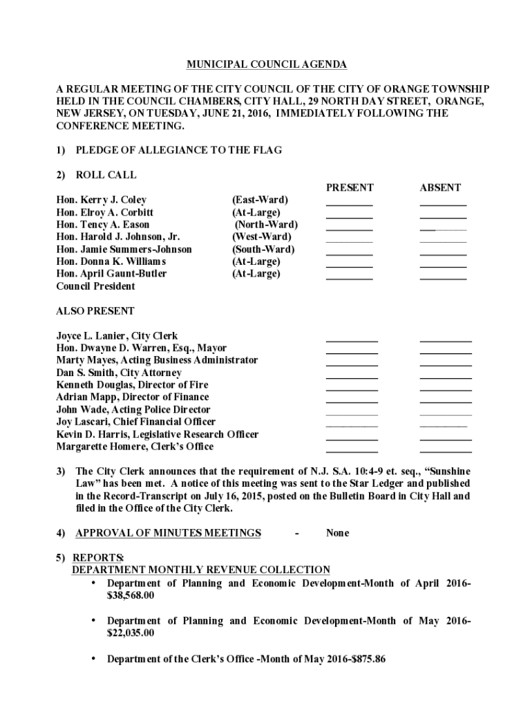 MUNICIPAL COUNCIL AGENDA A REGULAR MEETING OF THE CITY COUNCIL OF THE CITY OF ORANGE TOWNSHIP HELD IN THE COUNCIL CHAMBERS, CITY HALL, 29 NORTH DAY STREET, ORANGE, NEW JERSEY, ON TUESDAY, JUNE 21,